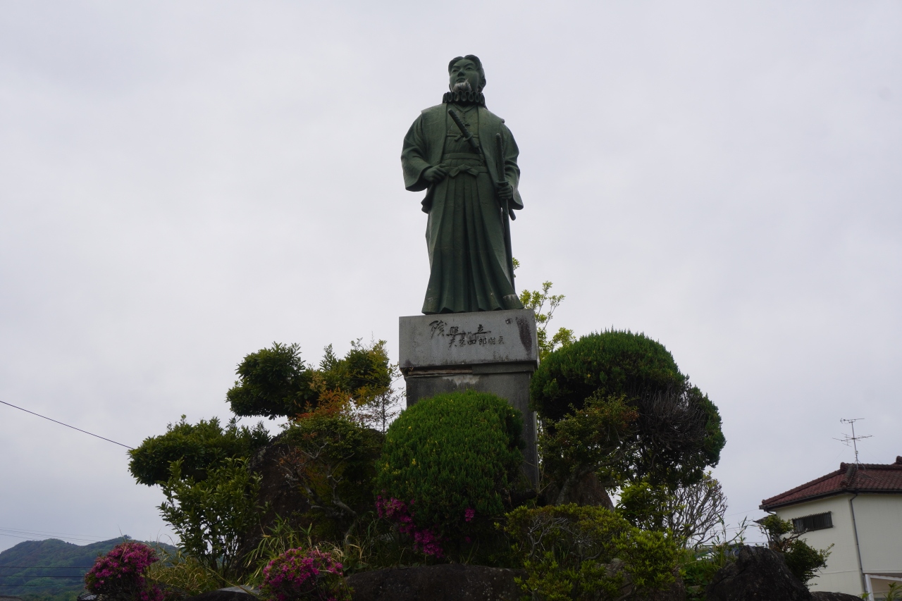 鬼池港の待合所前の広場の正面に、天草四郎時貞像が建っています。台座の代わりの小山も含めて全体に少し傷んだ感じもありますが、顔だちは固い決意を秘めているような精悍な表情。富岡城の攻略には失敗したものの、改めて原城を目指す天草四郎を表しているような気がします。