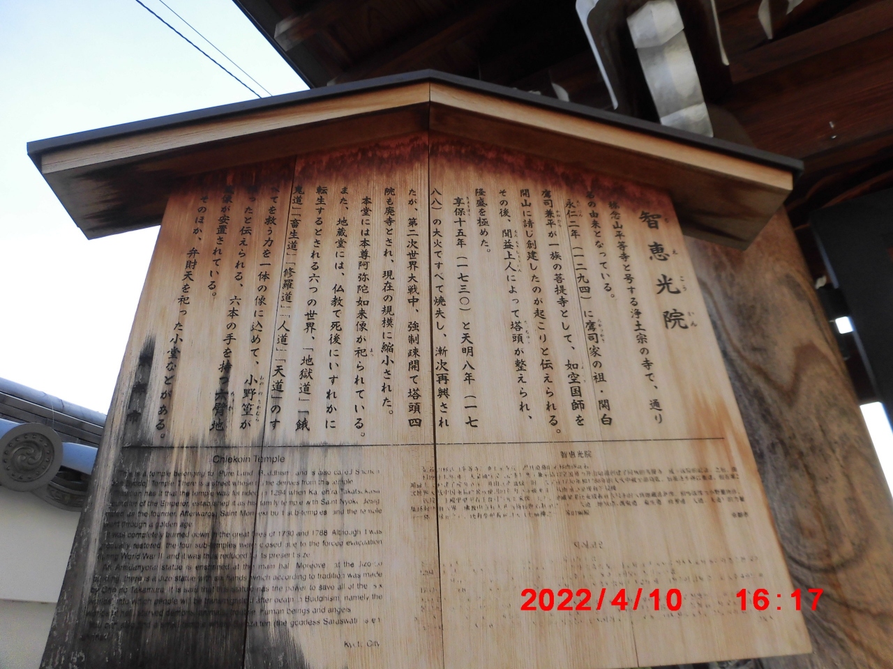 京都市観光で立ち寄りました。智恵光院は、称念山平等寺(びょうどうじ)と言う浄土宗のお寺で、智恵光院通りの名前の由来だそうです。伝承では、13世紀末に鷹司兼平が一族の菩提寺院として、如空国師を開山に請じ創建したのが創建とのことです。「関係者以外立ち入りを禁ズ」と言うことで、外から写真だけです。