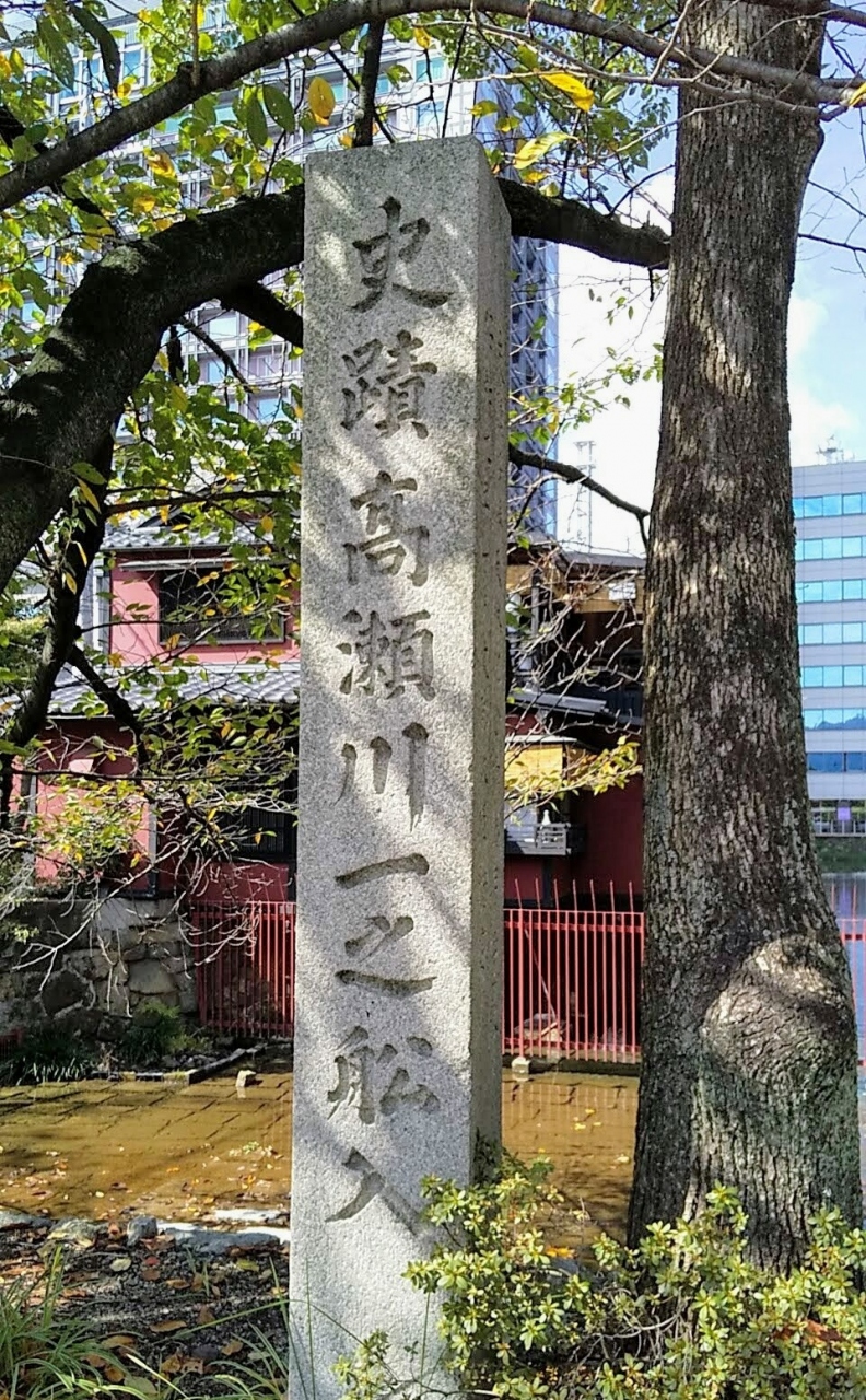 高瀬川沿いに木屋町通を北へ歩いていくと、「高瀬川一之船入」の石碑があり、高瀬舟が再現されていました。