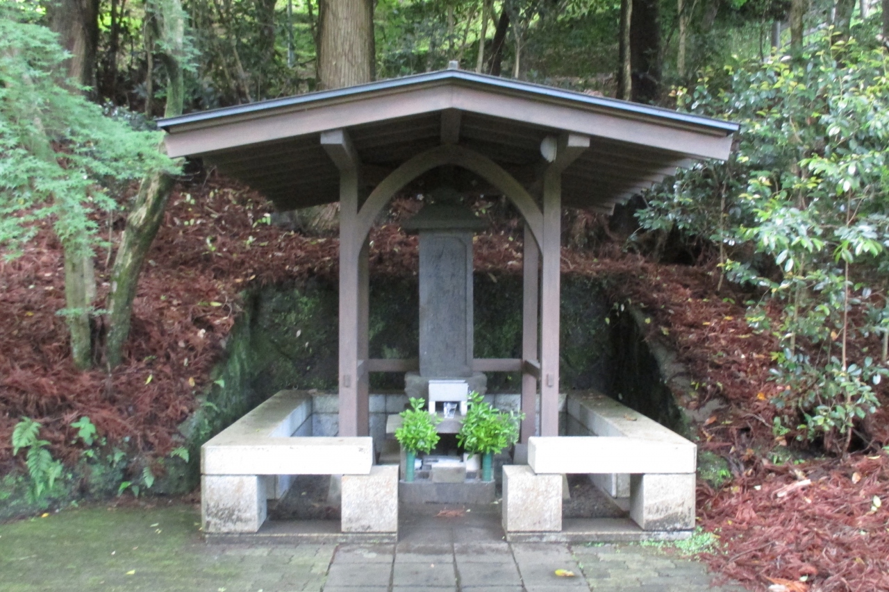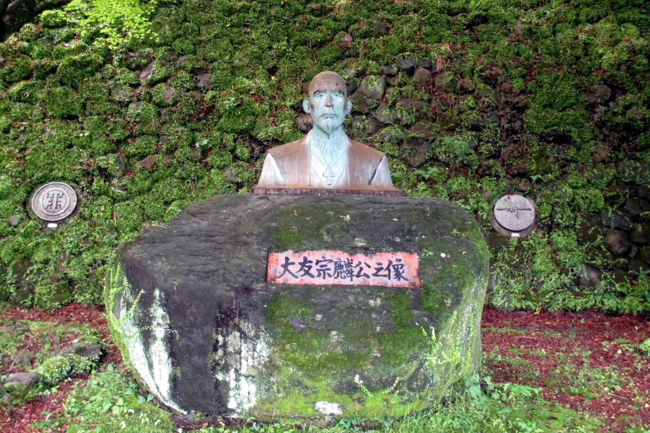 宗麟公園(大友宗麟の墓所)は、JR日豊線津久見駅の南東方向、直線で約1、300mくらいの、丘の中腹にありました。ここにはお墓が2つありました。1つは、1977年(昭和52年)に大友宗麟公顕彰会が建てたキリスト教式のものです。墓前の石敷きに何かデザインされていました。もう1つは、没後200年くらい経った後に旧家臣の末裔が建てたものです。宗麟さんの銅像は怖い顔をしたものばかりですが、ここに置かれている2つの銅像の1つは好々爺然とした優しいお顔の宗麟さんでした。JR津久見駅前にある彫刻家・高野佳昌さん制作の大友宗麟公之像の胸像部分の様に思います。人間味があってホッとしますよね。