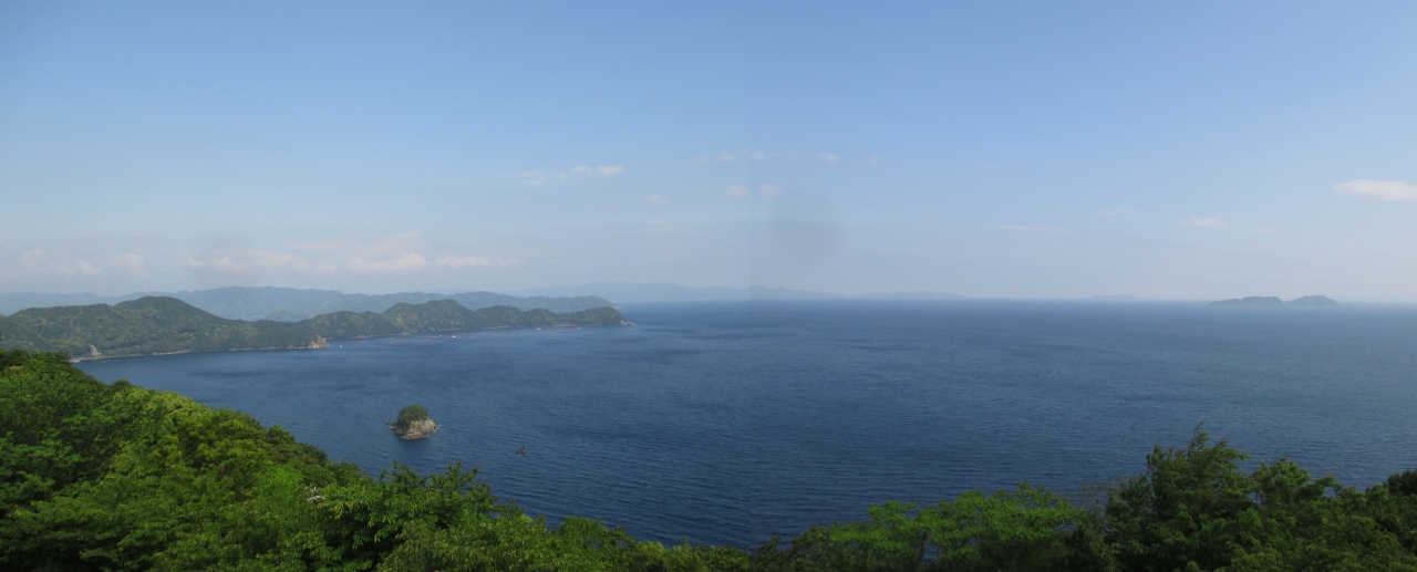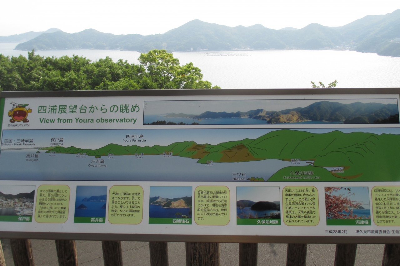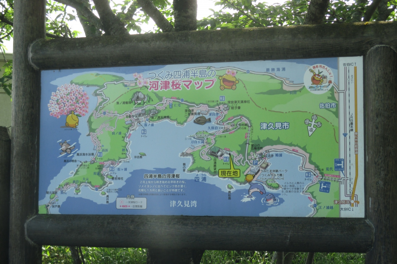 つくみイルカ島からどんどん坂道を上がった先に、四浦展望台がありました。ここからは四国も見えるそうですが、訪れた時は残念ながら見えませんでしたが、拡がる海は豊後水道でした。さば、あじだけでないお魚も元気に泳いでいるのでしょうね。津久見港から連絡船の通っている無垢島、そのすぐ先の沖無垢島が意外なほど大きく見えました。また、もう1つの連絡船の行き先である保戸島も四浦半島の先に重なって見えました。つくみイルカ島の駐車場には四浦半島の河津桜の始まりの案内がありましたが、ここの駐車場には、四浦半島(の津久見市側)で河津桜が特に多く見られるところの案内図がありました。