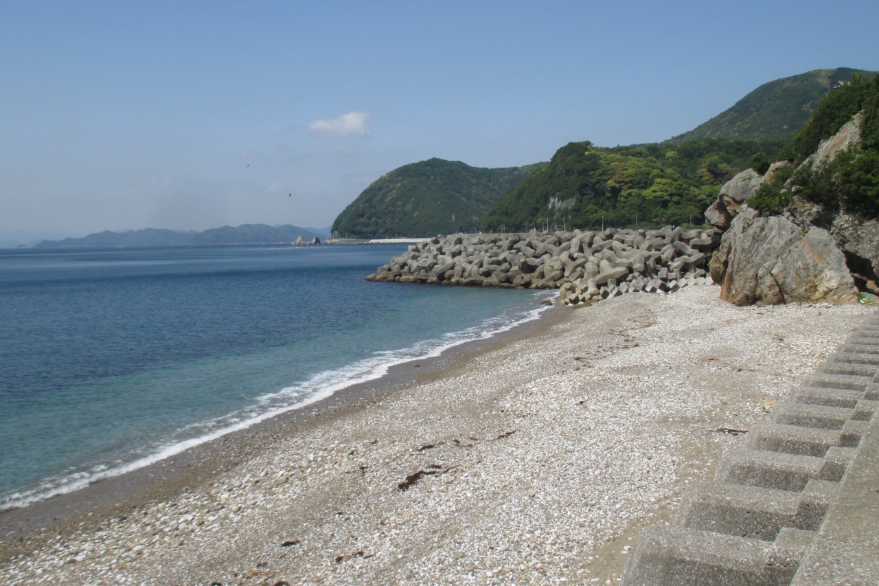小田の浜ビーチは、県道541号線を大浜海水浴場から南へ進み、蒲戸崎展望台の入口を通り越した先にありました。海水浴場としてはこぢんまりとしています。浜辺は砂浜が少なく、ほとんどところが砂利混じりですから、家族連れには向いていないと思います。右手遠くに景勝の三ツ石が見えました。なお、トイレ、シャワーはありました。