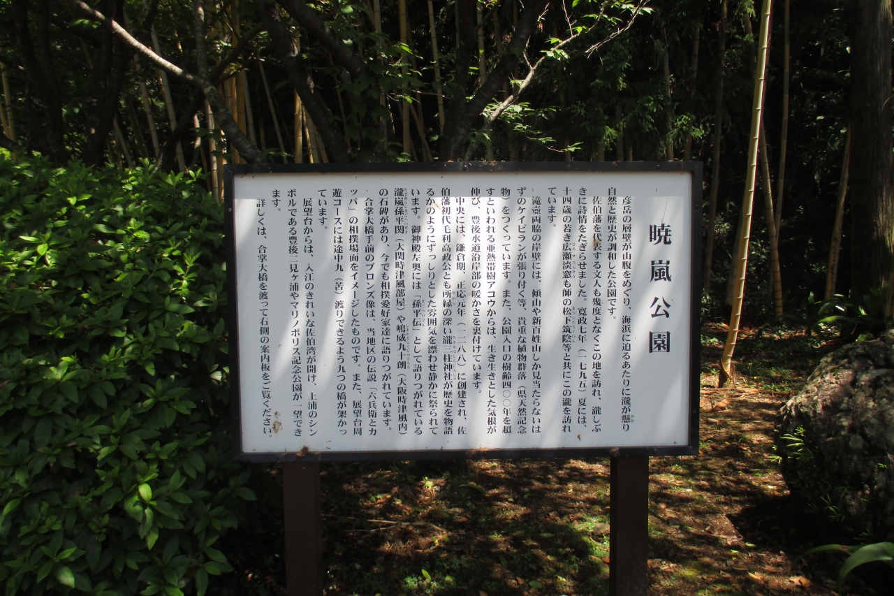 暁嵐公園はJR日豊本線の浅海井駅の山側にありました。(この浅海井駅は九州最東端の駅だそうですね)暁嵐の滝を中心に整備された公園とのことです。公園の中には、鎌倉時代に創建され、700年の歴史を持つという瀧三柱神社がありました、また、京都竜安寺をイメージしたという暁嵐石庭などがありました。竜安寺の石庭の面積は75坪だそうですが、この暁嵐石庭は60坪とのことです。石の配置や大きさはほぼコピーされているそうです。残念ながら、落葉がこれだけ溜まるとワビサビではなく侘しさを感じますね。
