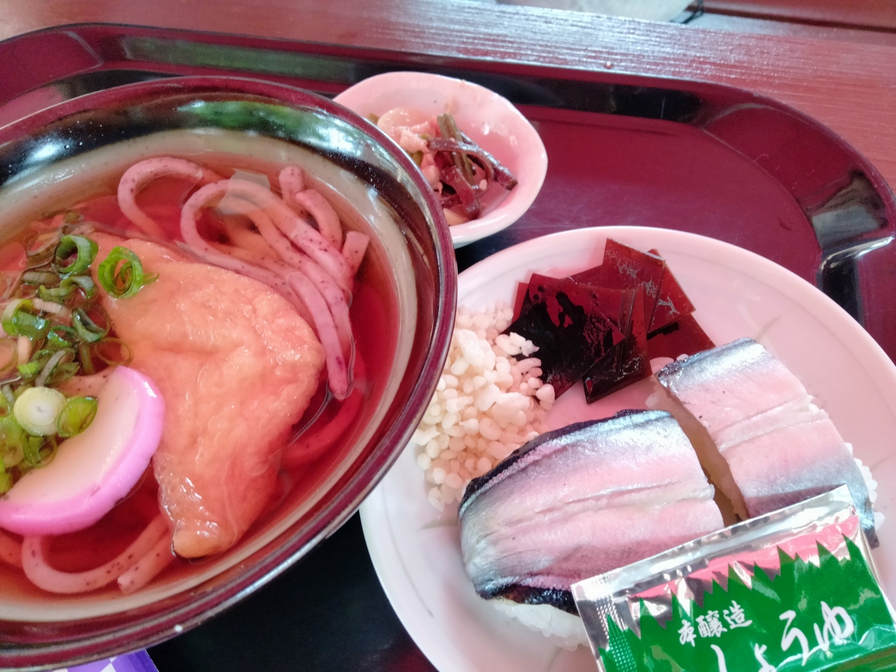 食事処では、「いざなみ米うどん+めはり寿司セット」や「いざなみ米うどん+さんま寿司セット」を格安(650円?)で、いただきました。