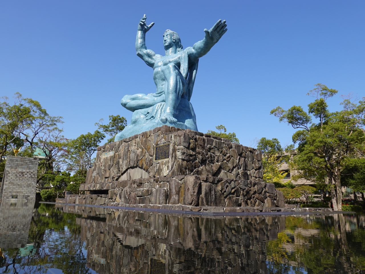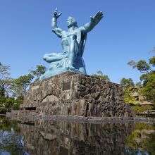 長崎の爆心地のすぐ北側にある平和公園の一番北側のところに平和記念像があります。高さ9.7メートル、重さ30トン、青銅製の平和祈念像です。迫力ある像で、天を指した右手は原爆の脅威を、水平に伸ばした左手は平和を、横にした右足は原爆投下直後の長崎市の静けさを、立てた左足は救った命を表し、軽く閉じた目は戦争犠牲者の冥福を祈っているそうです。何か訴えるもの感じる像でした。