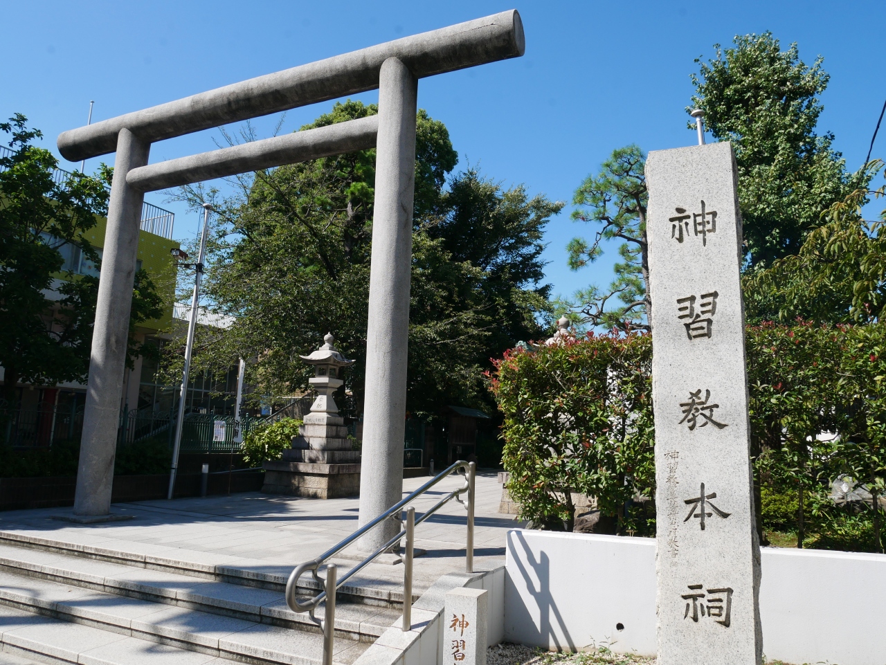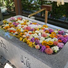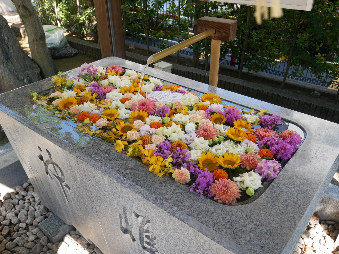 桜新町駅すぐにある神社。手水舎が花で飾られており、多くの人が写真を撮っていました。