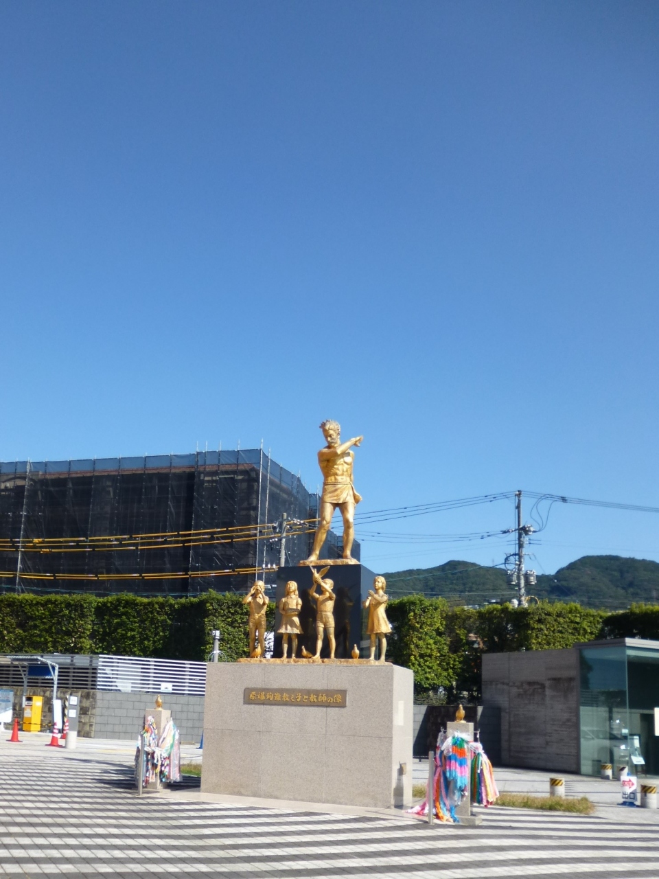 長崎の原爆資料館の東側に金色に輝く像が建っています。これが原爆殉難教え子と教師の像で、昭和57年に建てられたものです。家にいた国民学校の児童5800人余り、報国隊として工場に出動していた1900人余りの生徒、そして100人以上の教師たちが原爆投下により即死、または放射の影響により次々と亡くなったそうです。この悲惨な事実が忘れ去られることのないようにという思いのこもった像です。