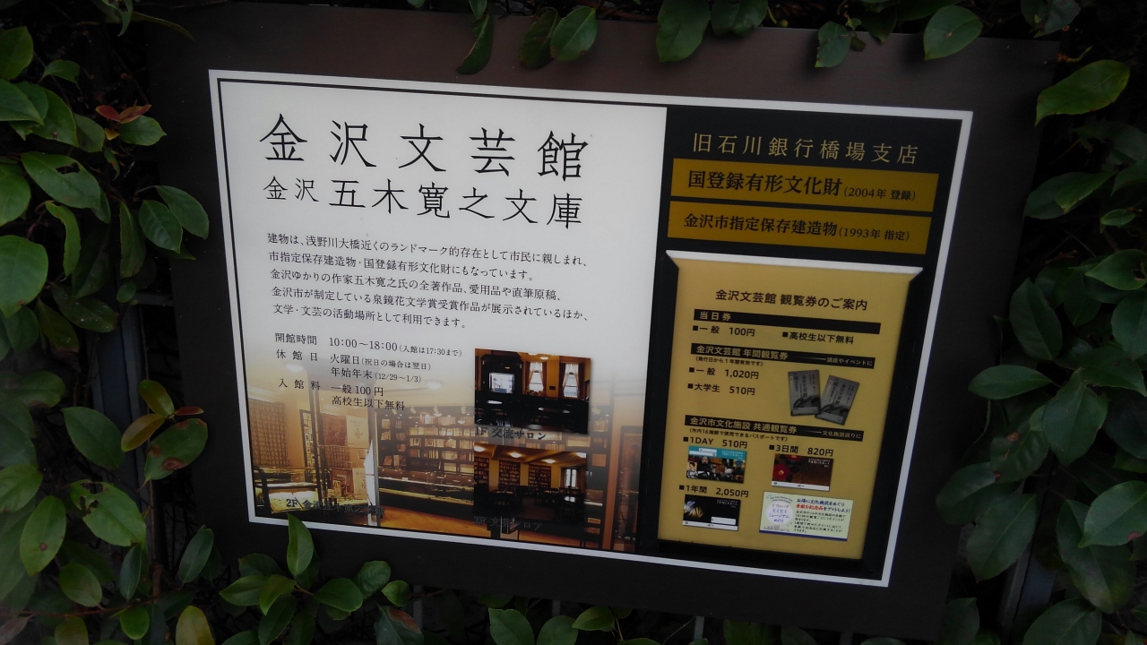 金沢文芸館は。主計町茶屋街からひがし茶屋街に行く途中の浅野川大橋のすぐ近くの交差点の一角にあります。重厚な洋館で、おしゃれな外観になっています、旧銀行の建物を利用しているそうです。入館料も安いし、時間のある時に立ち寄ってみるのもよいかと思います。