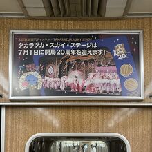 そのまま行けば宝塚大劇場のある宝塚駅まで行けるので、車内は他の神戸線や京都線と比べると宝塚歌劇関連の広告やポスターも多くあります。