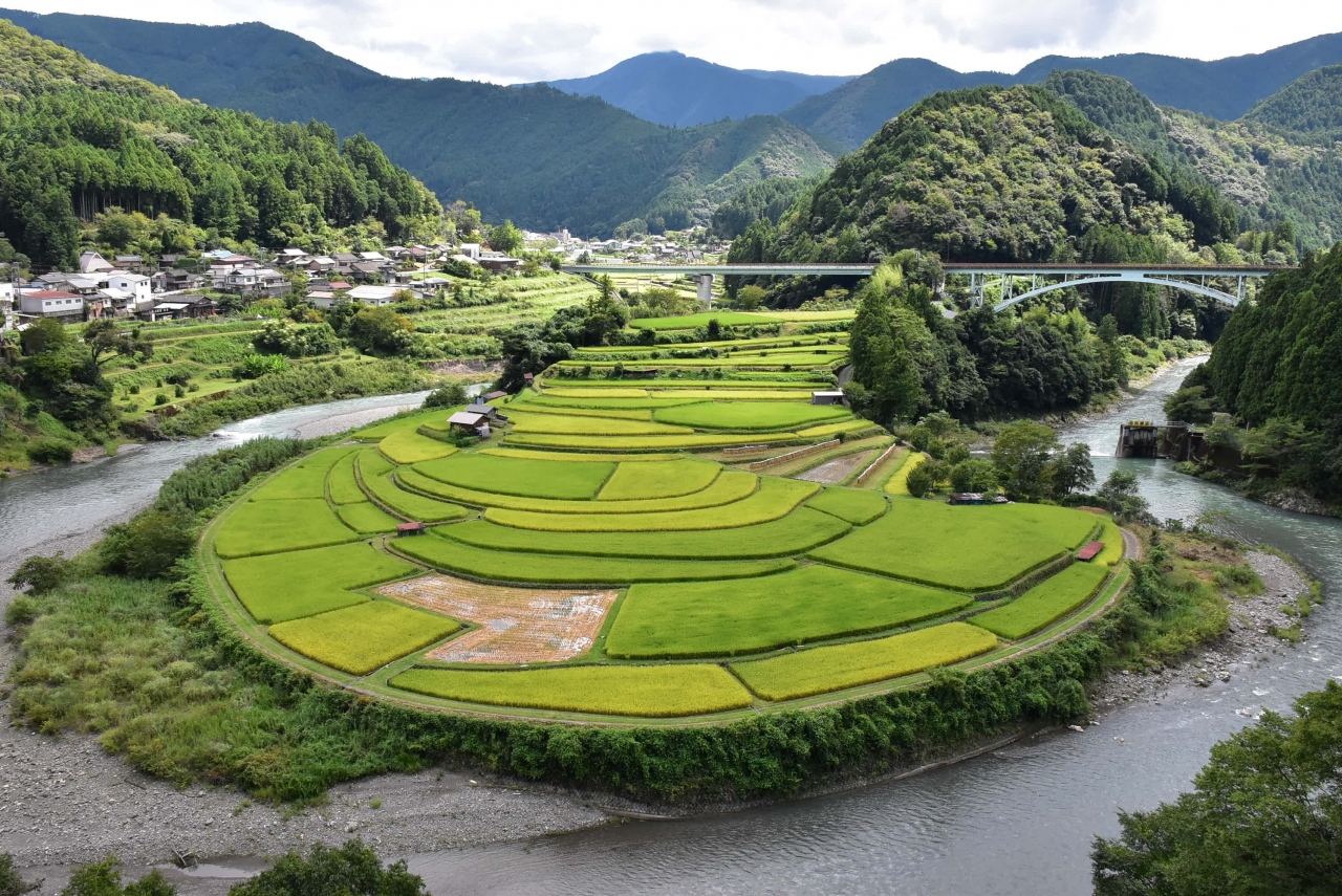 紀勢本線藤波駅から小型の路線バスに乗り、1時間ほど山奥に入ると、有田川の大きな蛇行により作られた日本でも唯一の扇形の棚田「あらぎ島」の絶景が見えてきます。