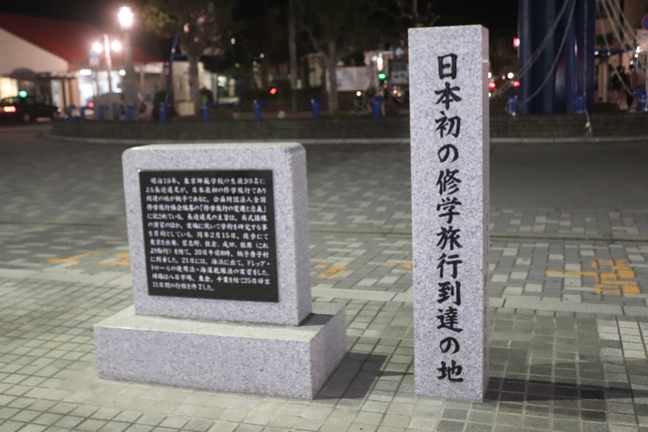 初めての修学旅行の目的地(到達地)が銚子だったという記念碑でJR銚子駅前に記念碑が建っています。明治19年の東京師範学校の長途遠足で東京と銚子を徒歩で往復したそうです。今とは異なり、修行や訓練のようであったのでしょうか。