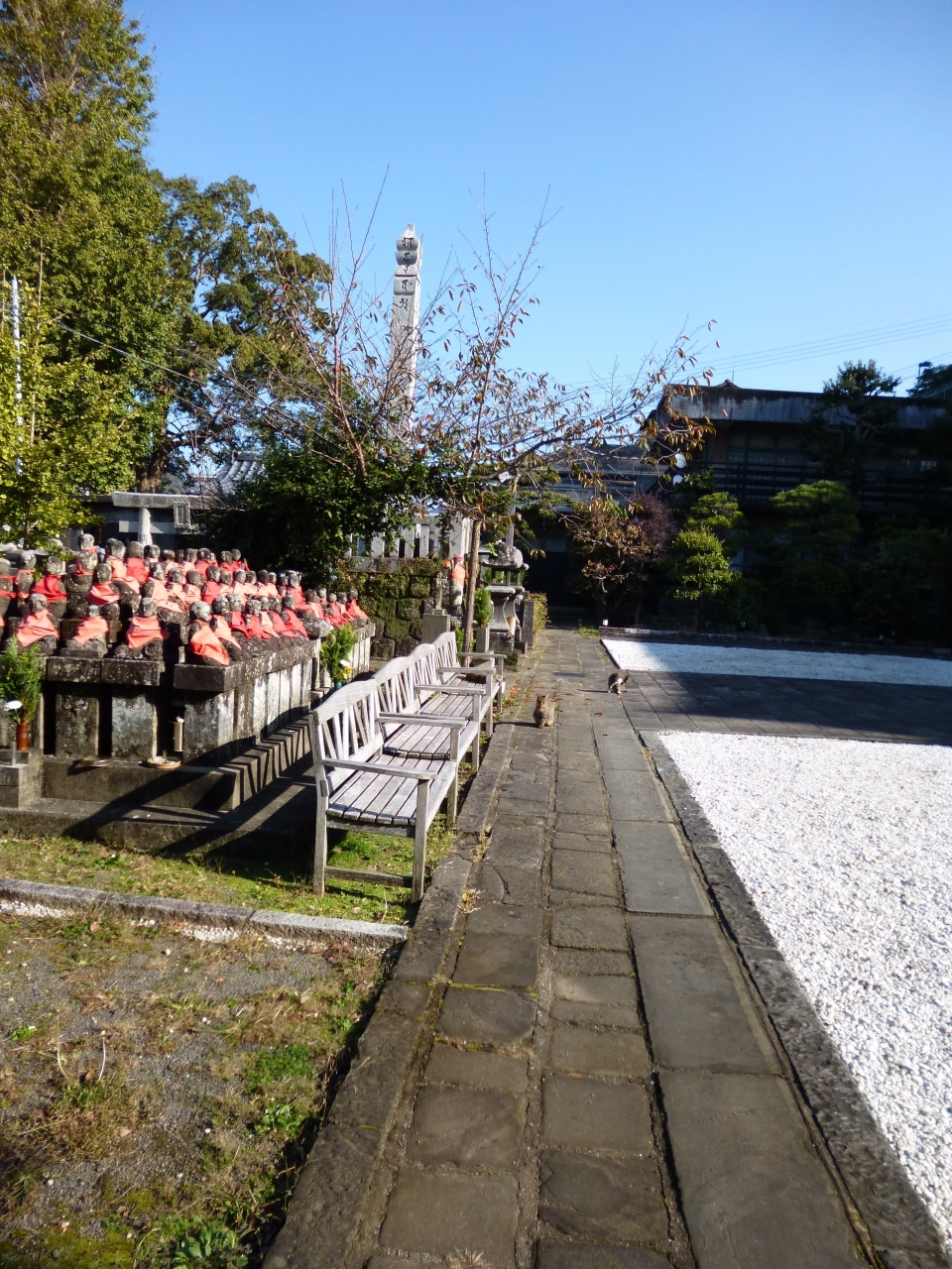 長崎駅から東へ歩いて行くと風頭公園の麓に寺町があり多くのお寺があります。この延命寺も400年前の創建と言われる歴史あるお寺です。長めの階段を上がって行くと、石造りの中門が見えてきます。明治33年に建てられてもので、鳥居のような面白い形の門です。門をくぐると、広めの敷地の奥に本殿があり、猫たちが多く日向ぼっこをしていました。