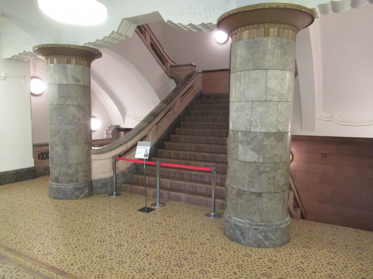 ゴージャスな梁や天井の柔らかな彫刻、これを支える石張りの柱などが観察できます。