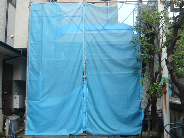 工事のための安全ネットの間隙から、大松稲荷神社の社殿は、それほど大きなものではありません。社殿の一部は、まだ、それほど劣化しているような感じはありません。