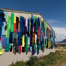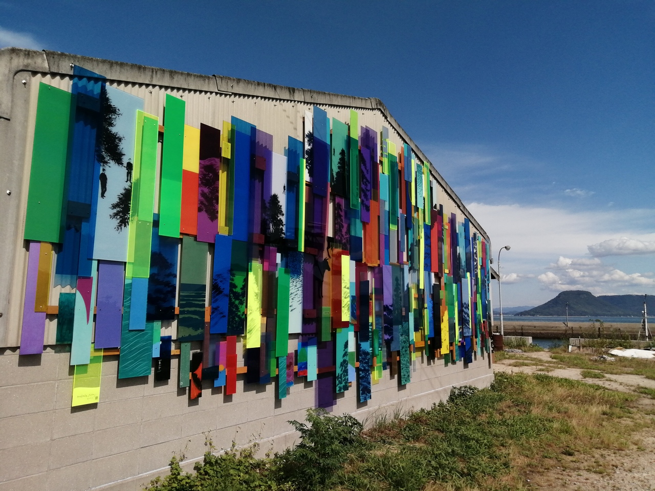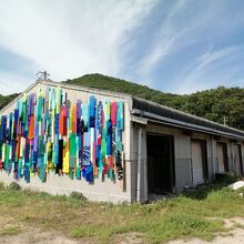 男木島集落の南端、男木魚港の一画にある倉庫の壁面に施されたアートです。もちろん瀬戸芸の作品の1つ。さまざまな色に塗られたアクリル板が貼られています。だから何?は禁句です。ケージツサクヒンですから…。より映える作品「歩く方舟」を見に行くついでにでも眺めてみて下さい。