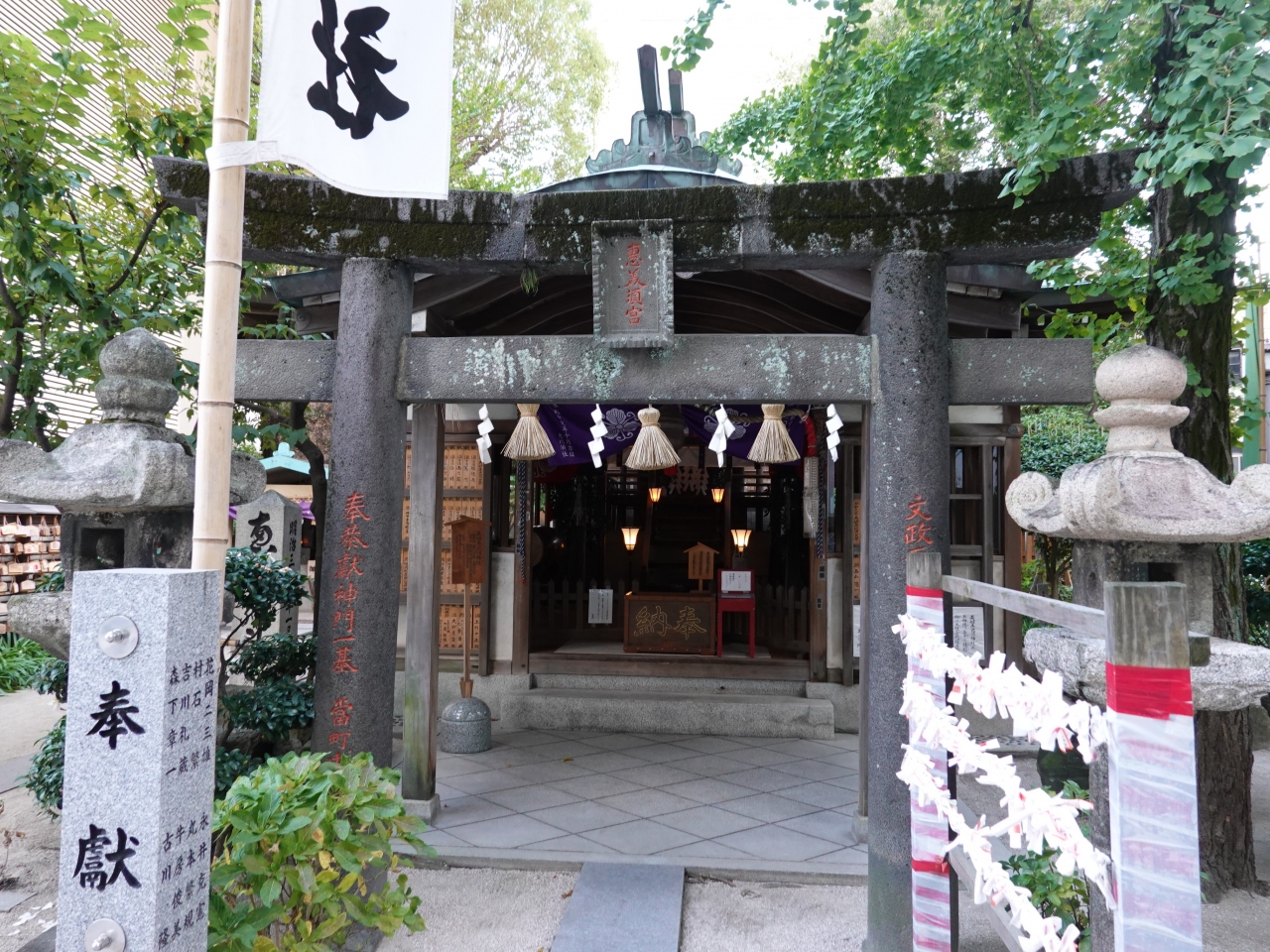 博多の総鎮守であり、博多祇園山笠で有名な櫛田神社の境内にある神社です。拝殿の向かいには、少し葉が黄色く色づき始めた夫婦銀杏の木がありました。三本の大樹が寄り添っているようで、手前一本が雌木で秋に黄金色の実をたくさんつけるそうで、夫婦円満・縁結びの霊樹として篤く信仰を集めているそうです。
