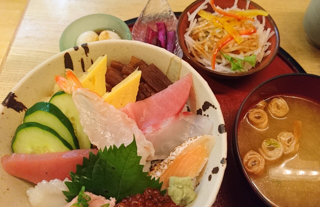 海鮮丼御膳は1500円ほど。サラダ、お味噌汁、甘味がついている。