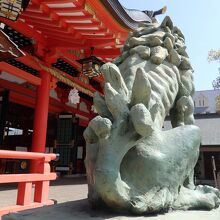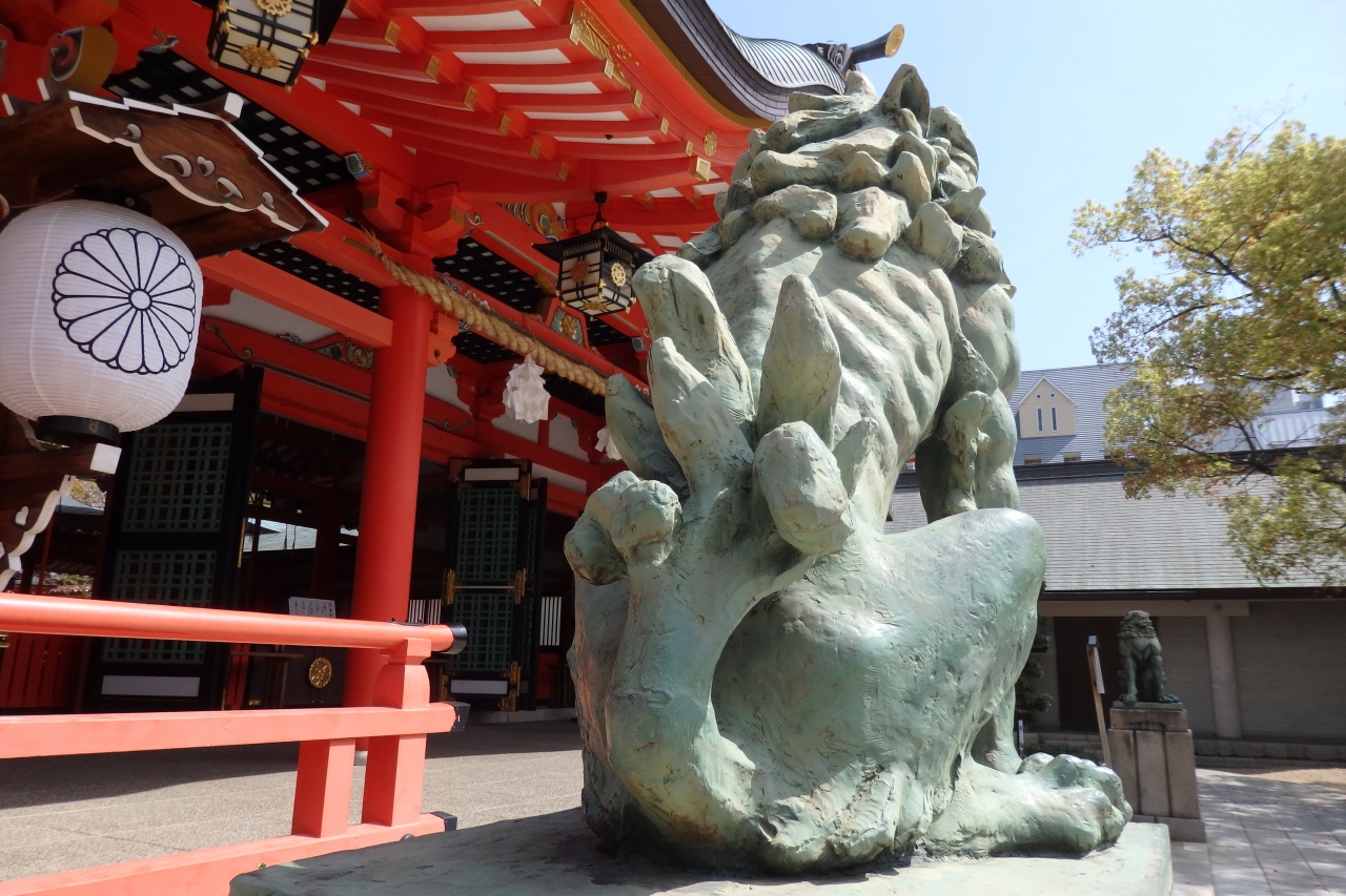 神戸の街のにぎやかな交差点にどーんと赤い鳥居があります。