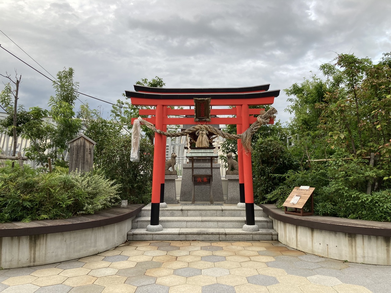 開業時に京都伏見稲荷大社から分祀され創建。原爆罹災のち、戦後再建との説明あり。