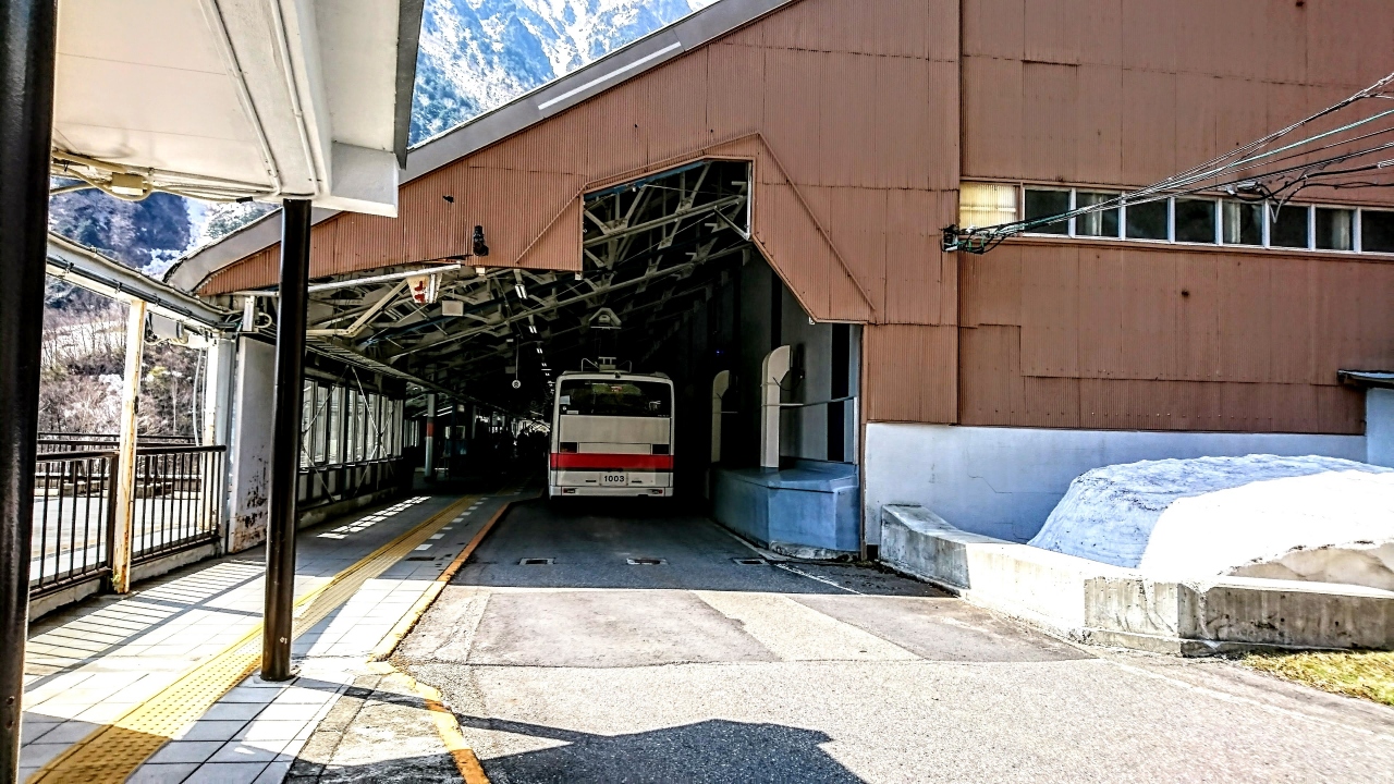 扇沢から黒部ダムまで結ぶのが関電トンネル電気バス だ。むかしはトロリーバスだったが、現在は電気バスに置き換えられている。現在でもバスはループに回って駅に入線するのでその名残を残している。観光シーズンには一度に5台ものバスが連なって観光客を運ぶので意外に輸送力はある。