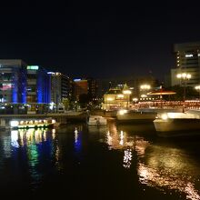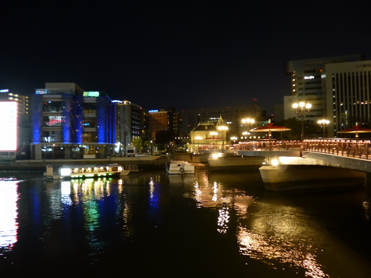 中洲の那珂川にかかる橋の一つ、西大橋。東西の中洲をつなぐ西大橋は、九州沖縄八県連合共進会が開かれた明治43年にかけられた橋で、貴賓館と同じ時期になります。当時は福博電気軌道といわれる路面電車がこの橋の上を通っていました。夜、橋の上から貴賓館方面を眺めると、那珂川の両側に広がるライトアップされた建物がきれいに見えます。