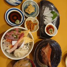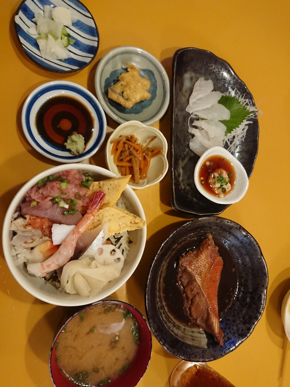 金目鯛の煮付け、カワハギの肝つきのお造り、チラシ寿司のセットで2000円を切るのは、素晴らしいです。