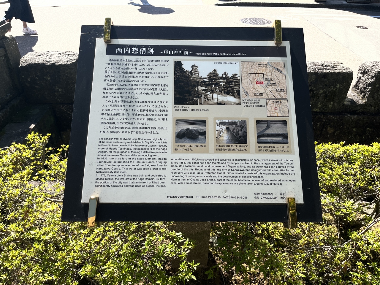「総構(そうがまえ)」とは、お城や砦などを囲んでいるところや囲まれているところの内部を指すそうです。写真つきの詳しい案内板があり、勉強になりました。尾山神社の神門前の階段のところにあるので、神社の参拝の際にあわせて見学できると思います。