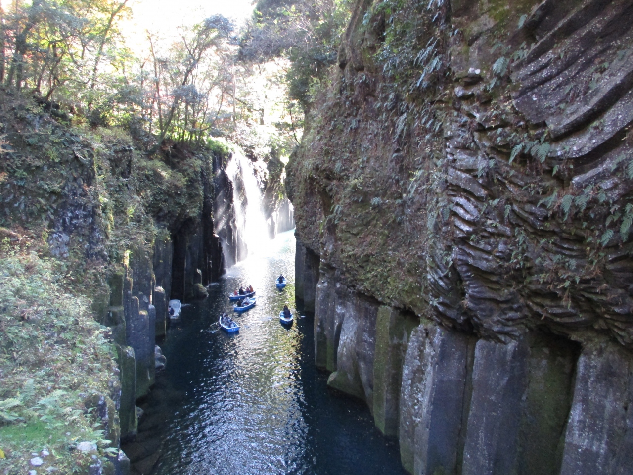 日本の滝百選に選定されている名瀑だそうです。高千穂峡の貸しボートに乗れば、至近距離から五ヶ瀬川に落ちる滝が見られます。地上からなら遊歩道を歩いて、真名井の滝展望台へ行きます。岩肌に沿うことなく、勢い良く落ちる滝でした。ボート上からでも展望台からでもこれぞ高千穂峡という景色が堪能できます。