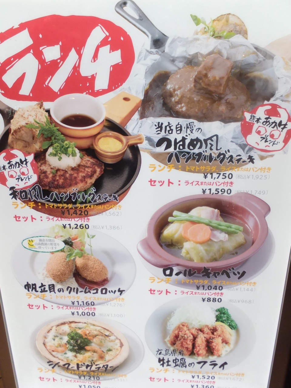 大船駅前のルミネ大船のレストラン街にあるお店ですので、わかりやすく便利です。こちらのレストラン街は今回初めての訪問ですが、いろいろありましたがこちらを訪問。ランチもやっていたので少しお得でした。おすすめっぽい「つばめ風、ハンブルグステーキ」を注文。ホイルに入ったおいしいハンバーグでとてもよかったです。
