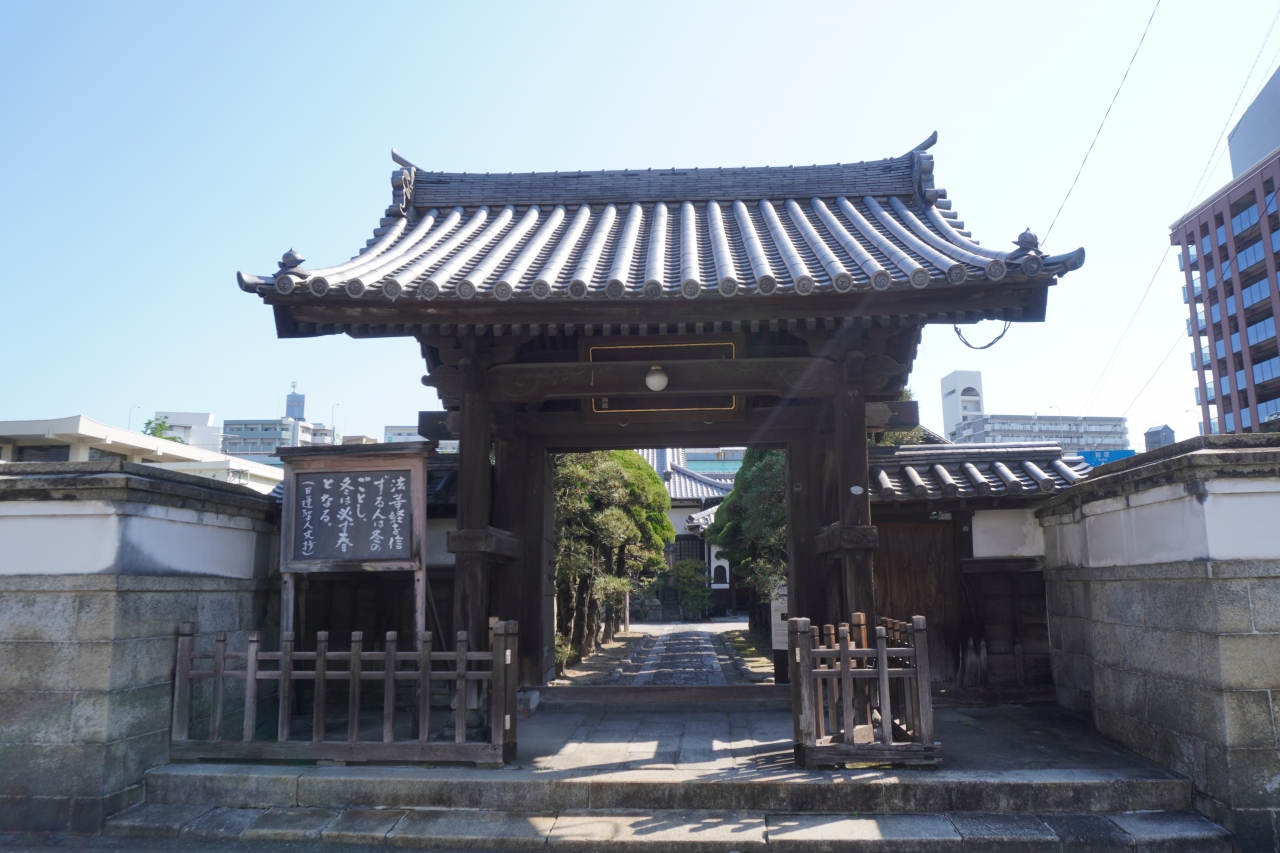 妙典寺は、明治通りからの入り口もありますが、堅町筋の山門からだと参道が長く続いて雰囲気がありますね。永徳元年(1381年)、柳川に創建された寺ですが、その後、当地に移転され、立花家の菩提寺となりました。江戸時代初期、京都妙覚寺の僧、日忠とキリスト教の宣教師、イルマンが宗論を行なった石城問答の地でもあるということ。山門入ってすぐの説明板に詳しい紹介がありました。