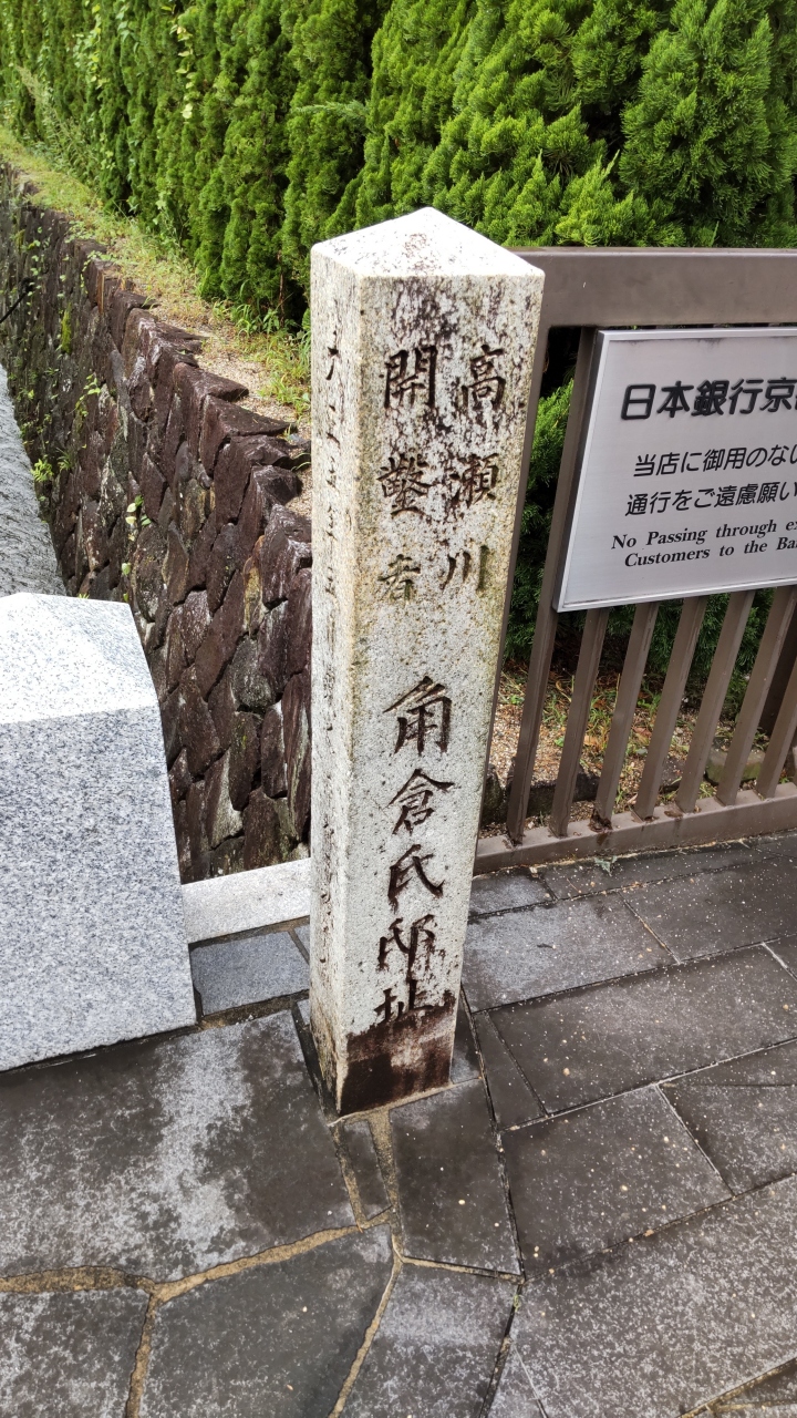 風情が残る高瀬川を鴨川から水を引き伏見まで開削したこの地の有力者邸を記念しているようです。 石柱が1本建っているだけですが、背後にある川と護岸、舟との景色がとても穏やかで美しかったです。