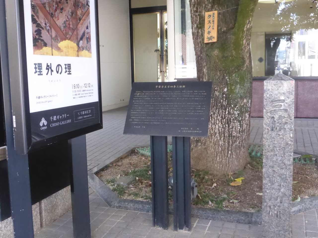 烏丸三条を西へ入った南側、株式会社千總の前に「平安京左京四条三坊跡」の案内板があります。並んで「三条烏丸御所跡」の石碑も建っています。この付近は平安京左京四条三坊九町に位置し平安時代には藤原光子の邸宅など大邸宅があったと言われていて、また鳥羽上皇の御所にもなったと言われています。以前、株式会社千總一階には「伊右衛門カフェ」があったのが今回無くなっていたのに驚きました。