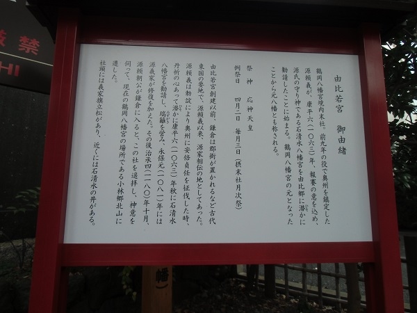 説明板によると、前九年の役で奥州を鎮定した源頼義が、康平6年(1063)、報賽の意を込め、源氏の守り神である石清水八幡宮を由比郷に潜かに勧請したことに始まります。