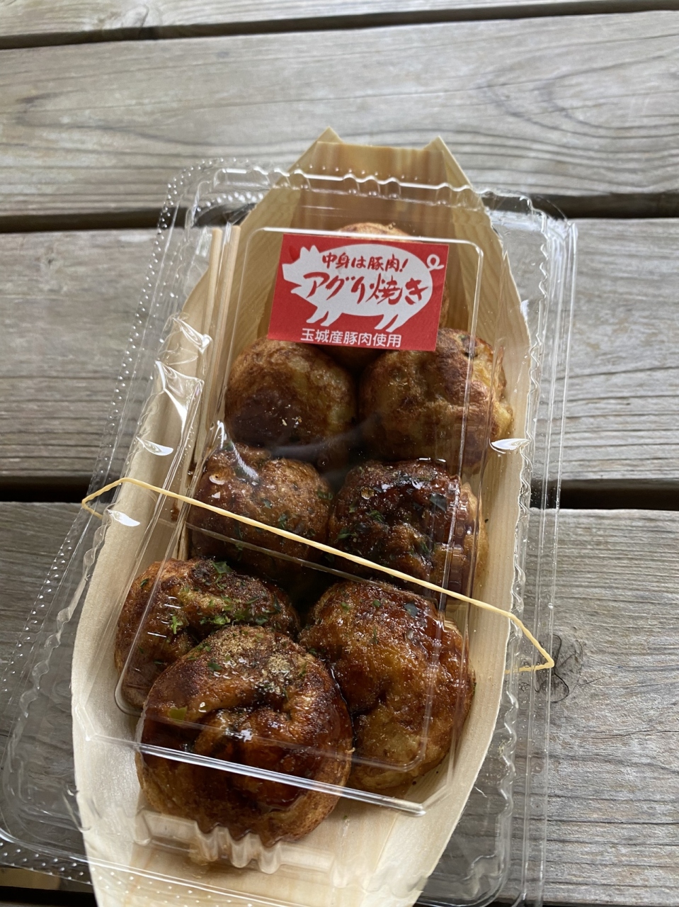 玉城町にある道の駅で売られているアグリ焼きを頂きました。アグリ焼きとはたこ焼きのたこの代わりに豚肉が入っているものです。生地に味が付いているためソースやマヨネーズ無しでもとても美味しかったです。豚肉と生地がマッチしていて良いと思いました。