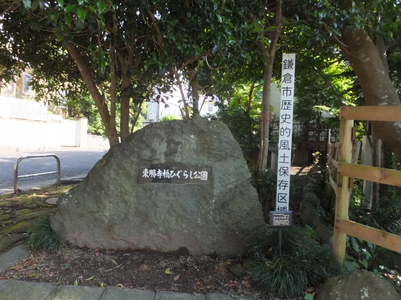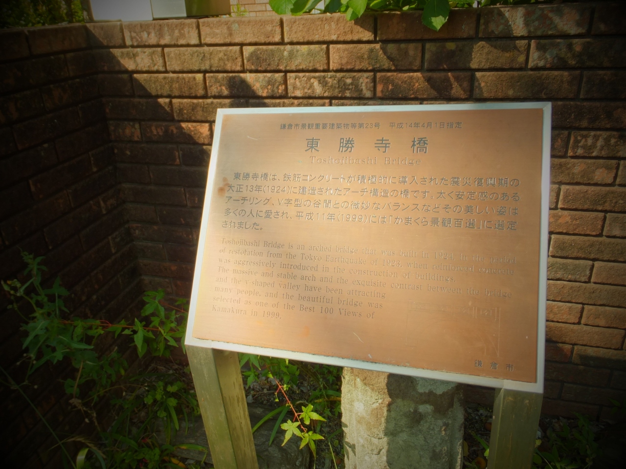 鎌倉にある橋です。場所は東勝寺に行く手前あたりです。大正時代に作られたというアーチ形式の橋で、滑川にかかっていました。説明板もあってわかりやすいです。橋の奥にはちょっとした広場(公園)もありましたし、ここを渡ると東勝寺跡地にすぐです。