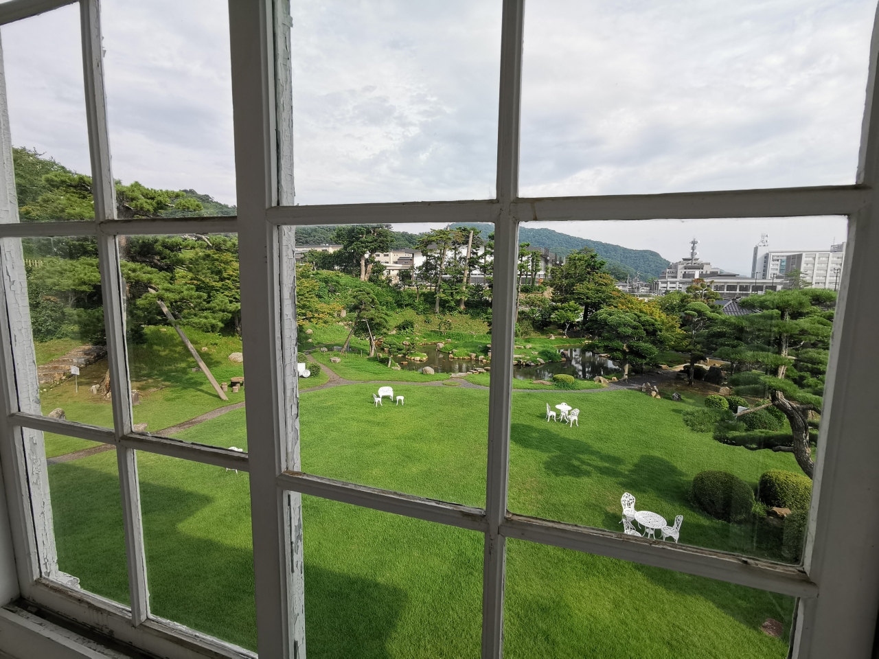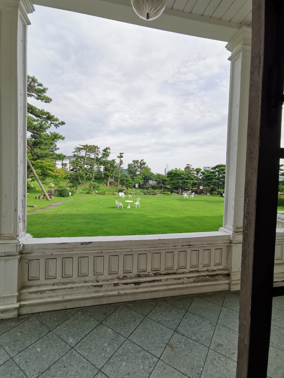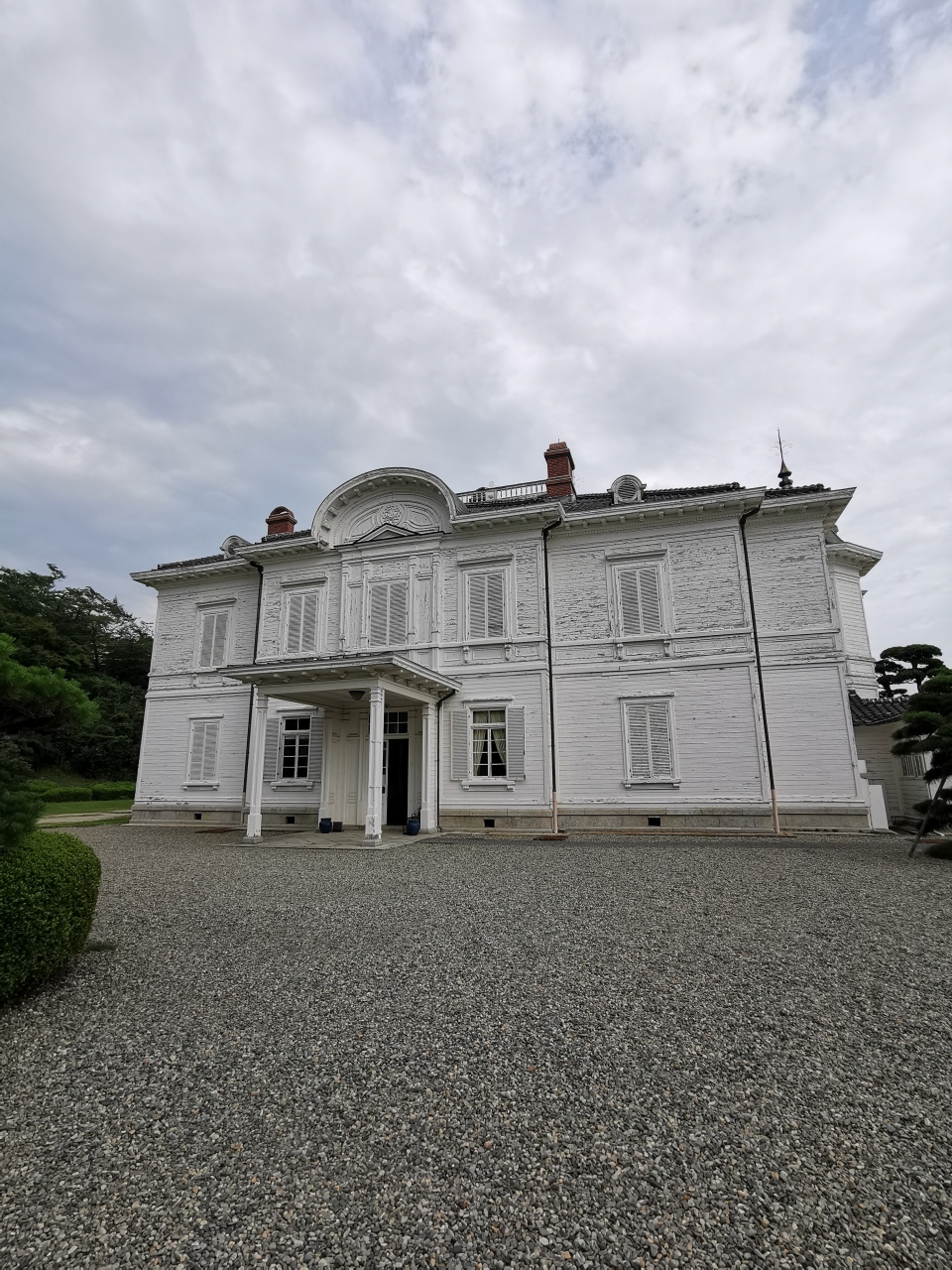 仁風閣を見学しました。フレンチ・ルネッサンス様式を基調とした木造瓦葺2階建てです。建築は明治40年。館内は有料で見学可能です。裏手は「宝隆院庭園」となっていて、館内2Fからはとても良いお庭の景色が見られます。庭園は江戸時代後期に造園されたとの事で回遊庭園となっていました。天気良くて緑がとても綺麗でしたね。