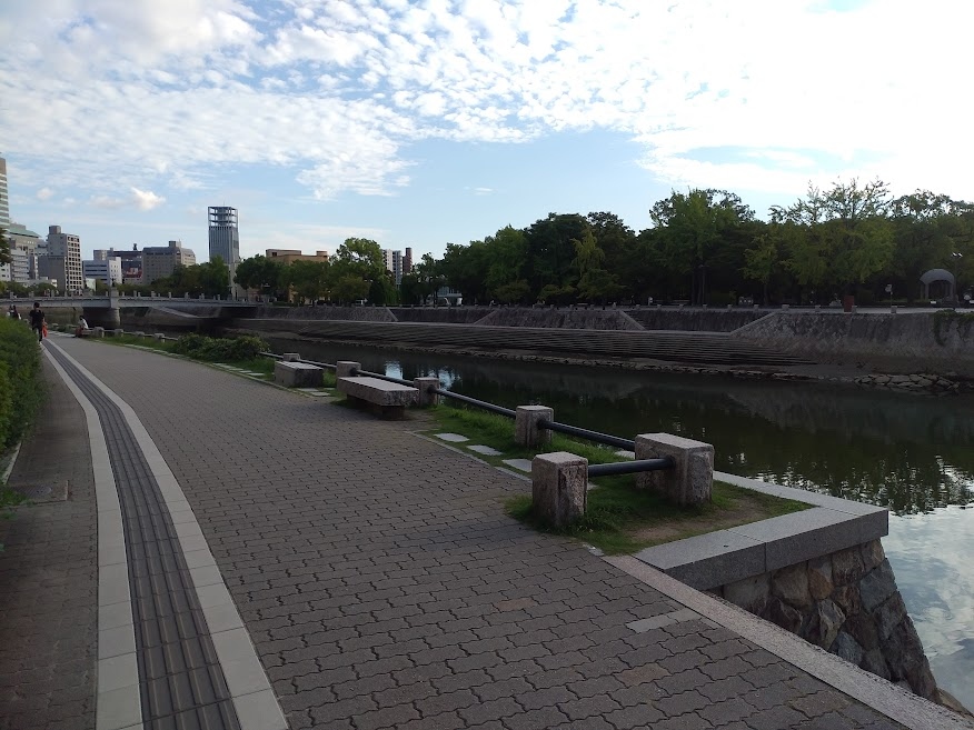 相生橋方面から、原爆ドームを左手に見て、平和記念公園方面、海に向かって歩いたところです。