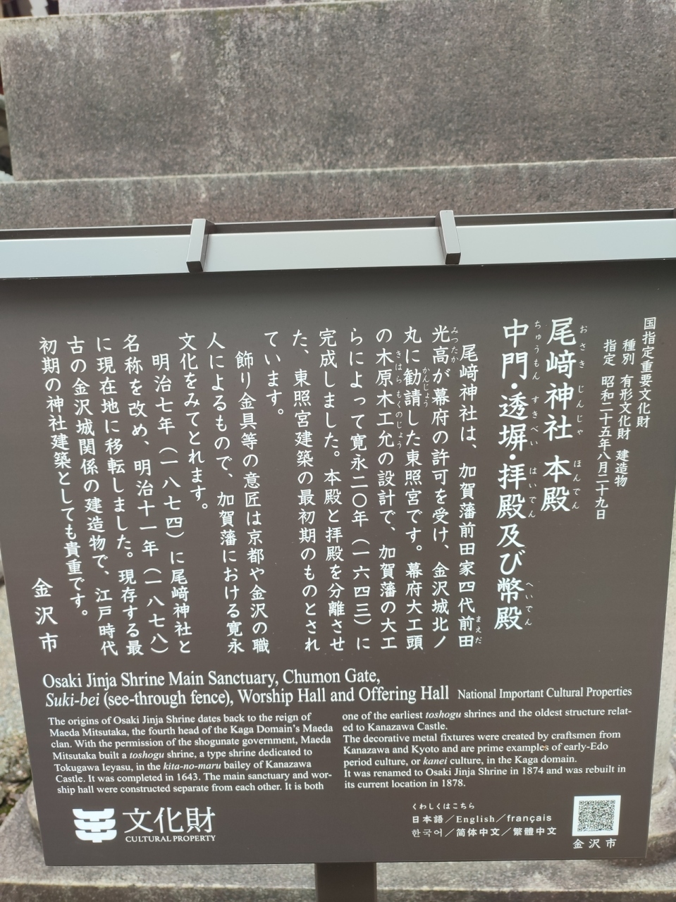 宿泊したユニゾイン近くだったので、金沢城に行く途中に立ち寄りました。ぱっと見の名称からはわかりにくいですが、金沢東照宮とも呼ばれるそうで、徳川家康などをお祀りしている場所で、さすがに立派でしたが、尾山神社ほどのインパクトはなかったです。