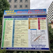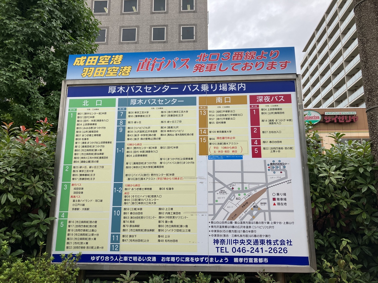 小田急線「本厚木」から発着するバス停は北口、南口、ミロード2側、それ以外は駅から徒歩で3分のバスセンターになります。行き先により以上の4ヶ所からの発着となります。バスセンターはイオン厚木と厚木シティプラザ(図書館)の間にあります。東口から地下道を利用すると雨の日も濡れずに行けます。羽田、成田空港直通バスはミロード2の裏側ですので注意してください。
