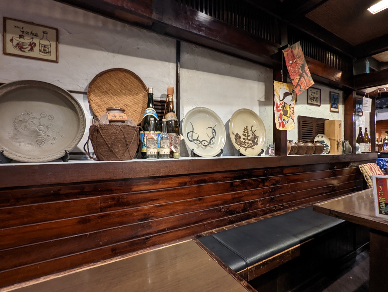 With its red-colored beams and pillars and lanterns lined up in a row at the entrance, this restaurant is sure to catch your eye with its gaudy decorations, at least at night. At first glance, it looks like an izakaya (Japanese-style pub) open only at night, but it's also open for lunch. However, the restaurant is dimly lit and has steps in some places, so care should be taken with your footing when using the restaurant. In addition, each room is designed as a semi-private room, which seems to protect your territory as an individual or group guest, but on the other hand, it's a bit difficult to call the staff. To this end, buzzers are placed above each table, but you may find it difficult to find the buzzers depending on your seat, as they seem to assimilate with the wood grain colors of the tables and the colorful tinted menus.
