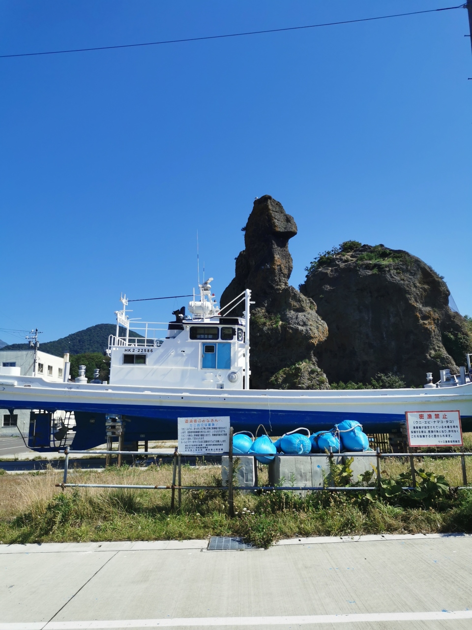 ウトロ漁港から見える巨大な岩「オロンコ岩」と同じく漁港に立つ「ゴジラ岩」。知床は町中でも巨岩が多くて生活の中に溶け込んでいる感じがします。ゴジラ岩は見る方向によってゴシラ感が変わりますので、なかなかポイントが難しいですね。