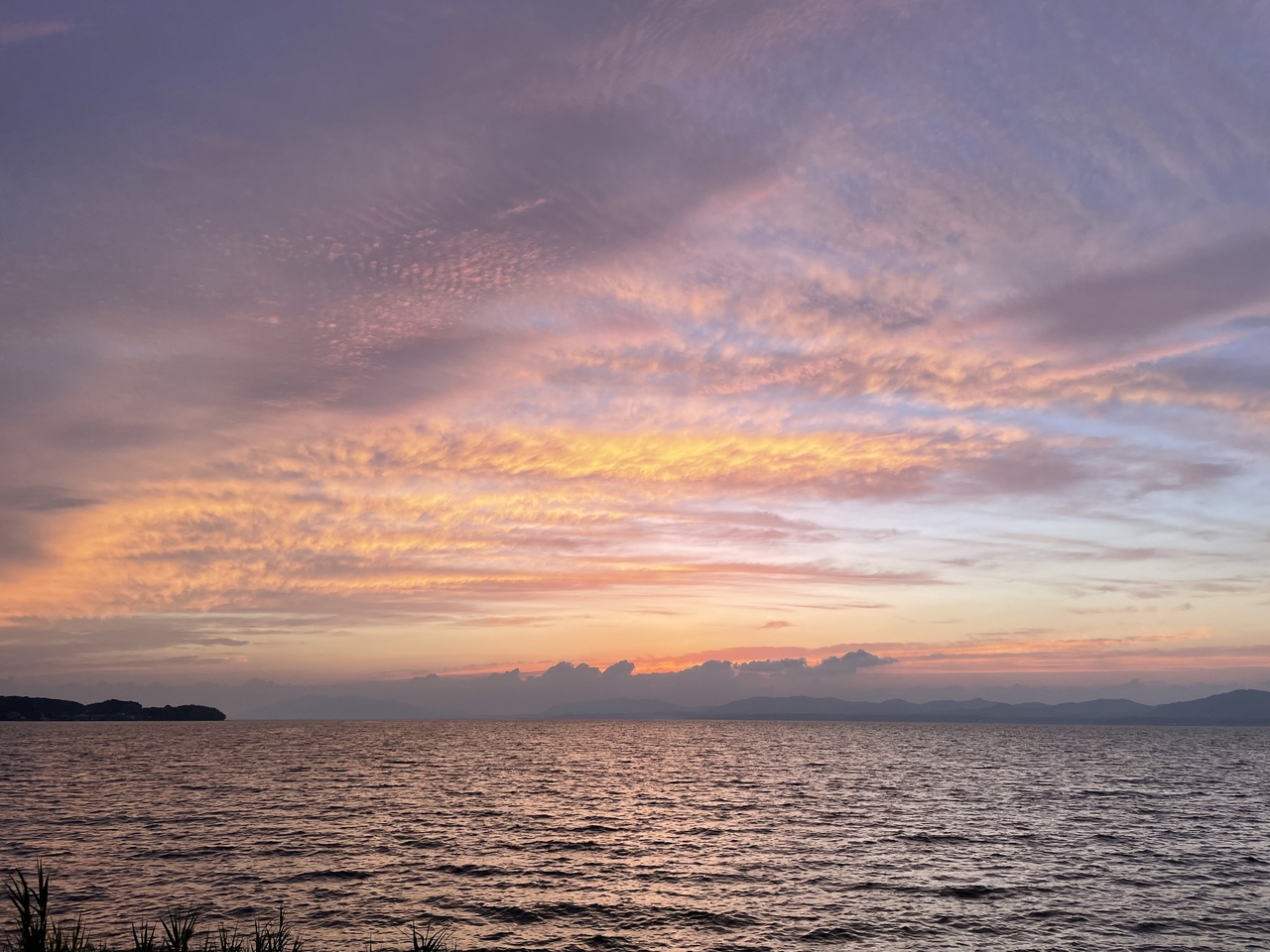 玉造温泉から自転車で15分ほどの西灘公園から夕日がきれいに見えました。公園はあまり人がおらず、ゆっくりと空の色が変わるを楽しむことができます。風が涼しいので羽織ものなどあった方がいいかもしれません。あと、下は草が生えているところなので、虫除けも。