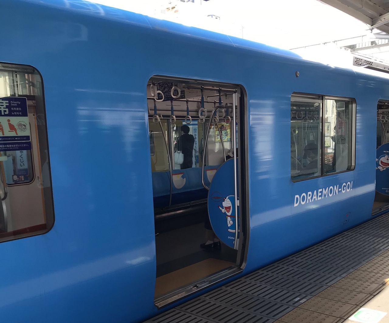 運良くドラえもんに遭遇しました!ドラえもん50周年を記念した西武鉄道のラッピング電車です。青い車体に車内のシートも青地にポケットの柄が座席にあってとても可愛かったです。なかなか出会えないので興奮しましたー!