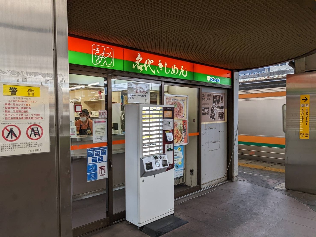 JR名古屋駅の在来線ホーム (7・8番線ホーム)にある名古屋名物「きしめん」のお店です。首都圏では「立ち食いそば」のお店は良く見かけますが、「立ち食いきしめん」のお店となると、ご当地名古屋ならではといった感じでした。カツオ節の出汁が効いた「きしめん」はあっさりとしていて美味しかったです。