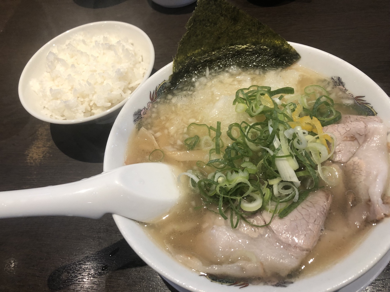 来来亭のランチサービスは単品のラーメンを注文するとライス(大、中、小)無料です。今回、初めて塩ラーメンをいただきました。麺かためのネギ多め、ライスは中。麺は細麺で、焼き豚に白ねぎのみじん切り(?)、海苔、柚子皮、あっさりとしたスープですが塩味はしっかり効いています。