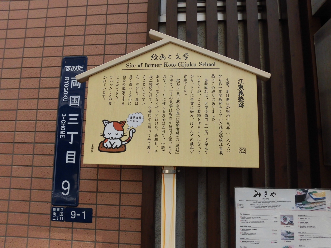 江東義塾跡は両国3丁目の住宅街の中に、旧跡として高札が立てられています。どのような生徒が通っていたのかよくわかりませんが、多分、現在の予備校的な学校だったかもしれません。高札には夏目漱石が教壇に立っていたことも記されていて、著名な文学者も生活のため大変だったのだろうと思いました。