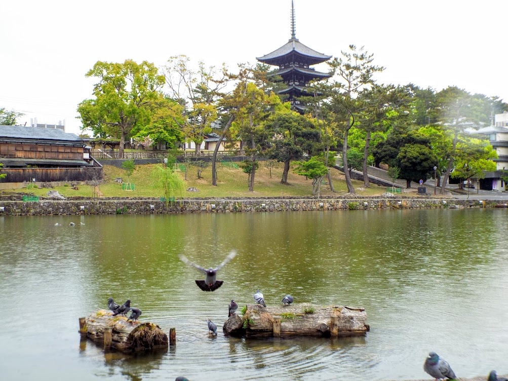 猿沢池は、池越しに興福寺の五重塔を見ることができるビューポイントです。市民の憩いの場としても愛されるこの池に伝わる、悲恋の物語や七不思議が、今でも石盤に刻まれて伝えられています。周りにはハトや野鳥が静かに川面で遊ぶ姿が、とても心癒されます。