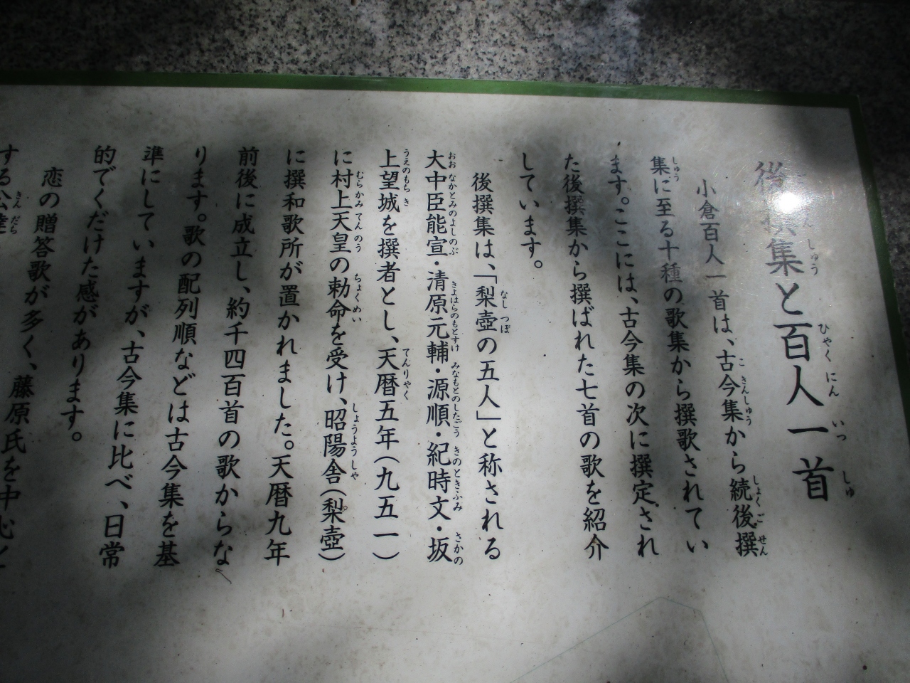 藤原定家が編纂した小倉百人一首。その舞台となった嵐山・嵯峨野エリアのあちこちに百人一首の歌碑が建てられています。私は亀山地区や野宮地区で見ました。自然石に一首ずつ刻まれています。百人一首好きな方にはとても興味深いところだと思います。