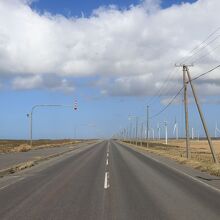 一面に広がる原野とひたすら続くまっすぐな道路。風力発電所も沿道にありいくつも並ぶ巨大な風車も見どころの一つとなっています。景色はまるでアメリカの映画に出てきそうな光景で近くまで来たら是非通ってほしいところです。平坦なところだけではなく一部にはカーブやアップダウンがある箇所もあり速度の出し過ぎは禁物。