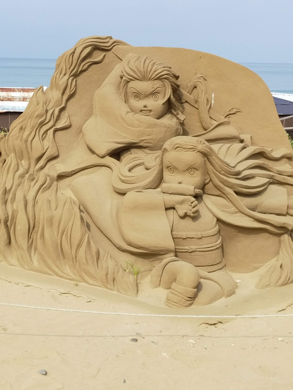 駐車場脇にドラえもんや鬼滅の刃のサンドアートが鎮座していた。
